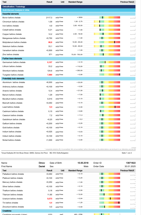 Представяме ви снимки от лабораторните резултати на един наш малък пациент преди и след децинтоксикацията, която в случаят протече на 2 етапа, защото някои тежки метали не се прихващат от стандартните хелатори, които се употребяват в момента.